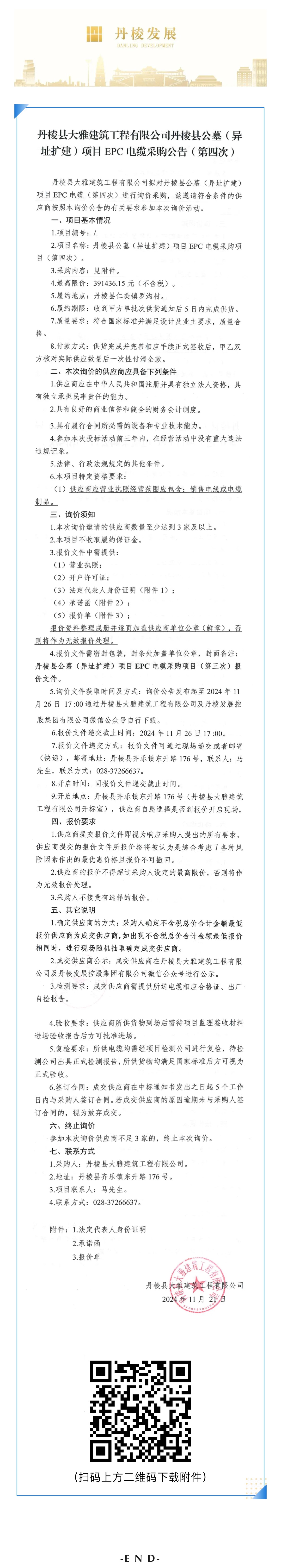 丹棱縣大雅建筑工程有限公司丹棱縣公墓(異址擴(kuò)建)項(xiàng)目EPC電纜采購公告(第四次)
