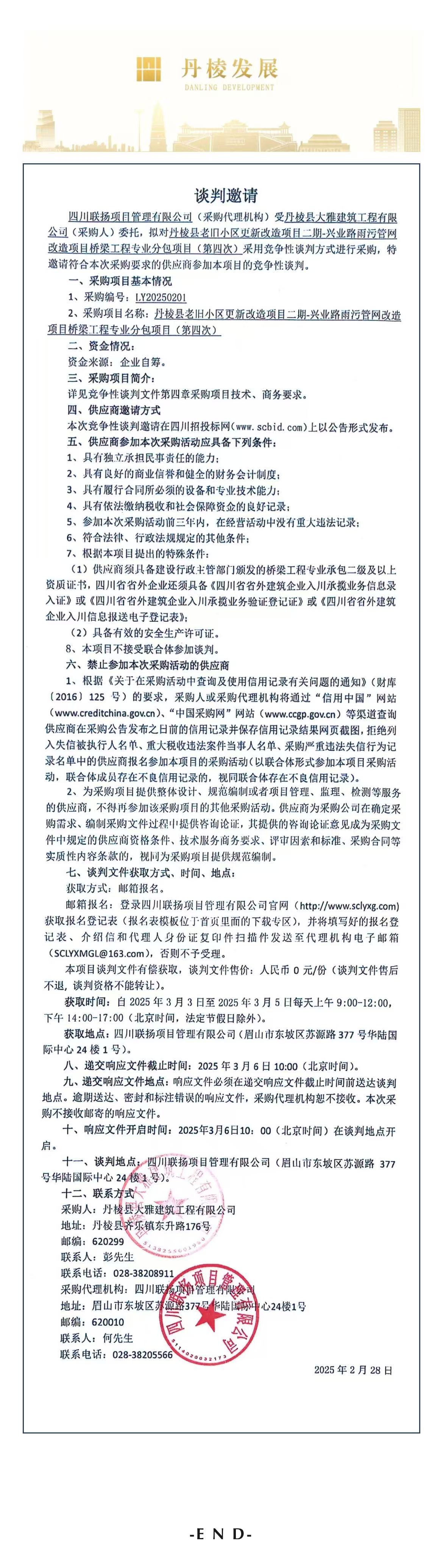 丹棱縣老舊小區(qū)更新改造項目二期-興業(yè)路雨污管網(wǎng)改造項目橋梁工程專業(yè)分包項目談判邀請公告(第四次)