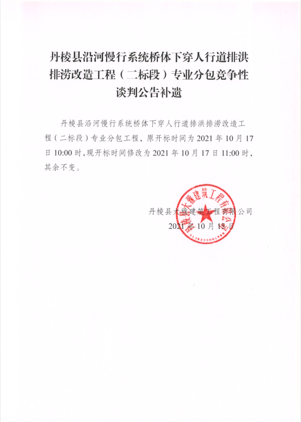 【大雅建筑公司】丹棱縣沿河慢行系統(tǒng)橋體下穿人行道排洪排澇改造工程(二標(biāo)段)專(zhuān)業(yè)分包競(jìng)爭(zhēng)性談判公告補(bǔ)遺
