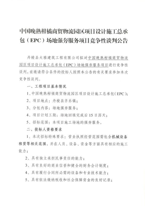 【大雅建筑公司】中國晚熟柑橘商貿(mào)物流園區(qū)項(xiàng)目設(shè)計(jì)施工總承包(EPC)場(chǎng)地強(qiáng)夯服務(wù)項(xiàng)目競(jìng)爭(zhēng)性談判公告