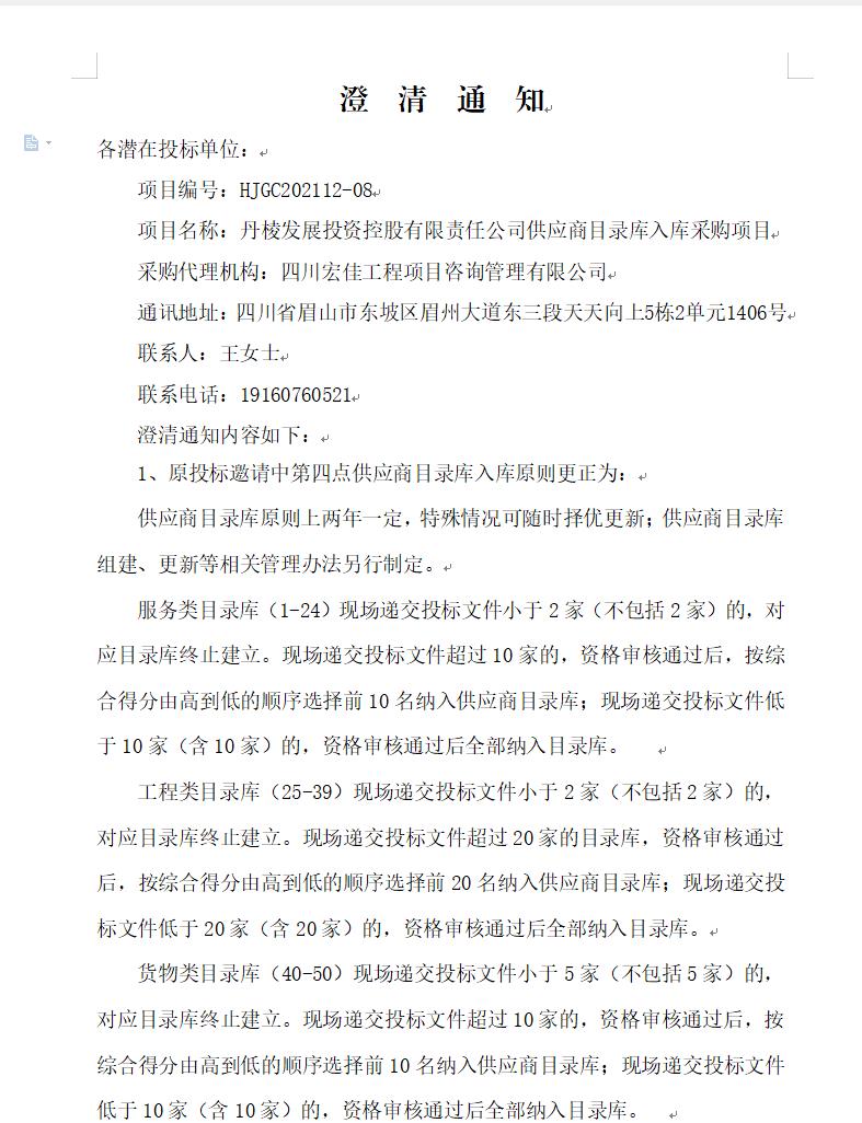 【丹發(fā)展公司】丹棱發(fā)展投資控股有限責任公司供應商目錄庫入庫采購項目澄清通知