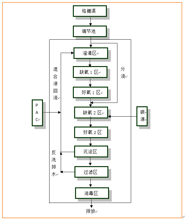 污水首先通過格柵去除漂浮物等較大垃圾,減少污水中頭發(fā)絲、絨狀絮體等細(xì)小漂浮物進入后端生化處理系統(tǒng)。格柵渠設(shè)置在調(diào)節(jié)池內(nèi)。通過格柵攔截污水中的纖維狀及較大的顆粒狀雜質(zhì)。調(diào)節(jié)用以均衡水量、水質(zhì),內(nèi)置潛污泵及回流措施,以保證一定的額定流量提升至污水處理設(shè)備。