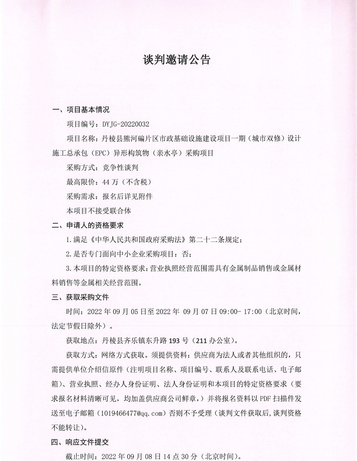 丹棱縣熊河碥片區(qū)市政基礎(chǔ)設(shè)施建設(shè)項(xiàng)目一期(城市雙修)設(shè)計(jì)施工總承包(EPC)異形構(gòu)筑物(親水亭)采購項(xiàng)目談判邀請公告