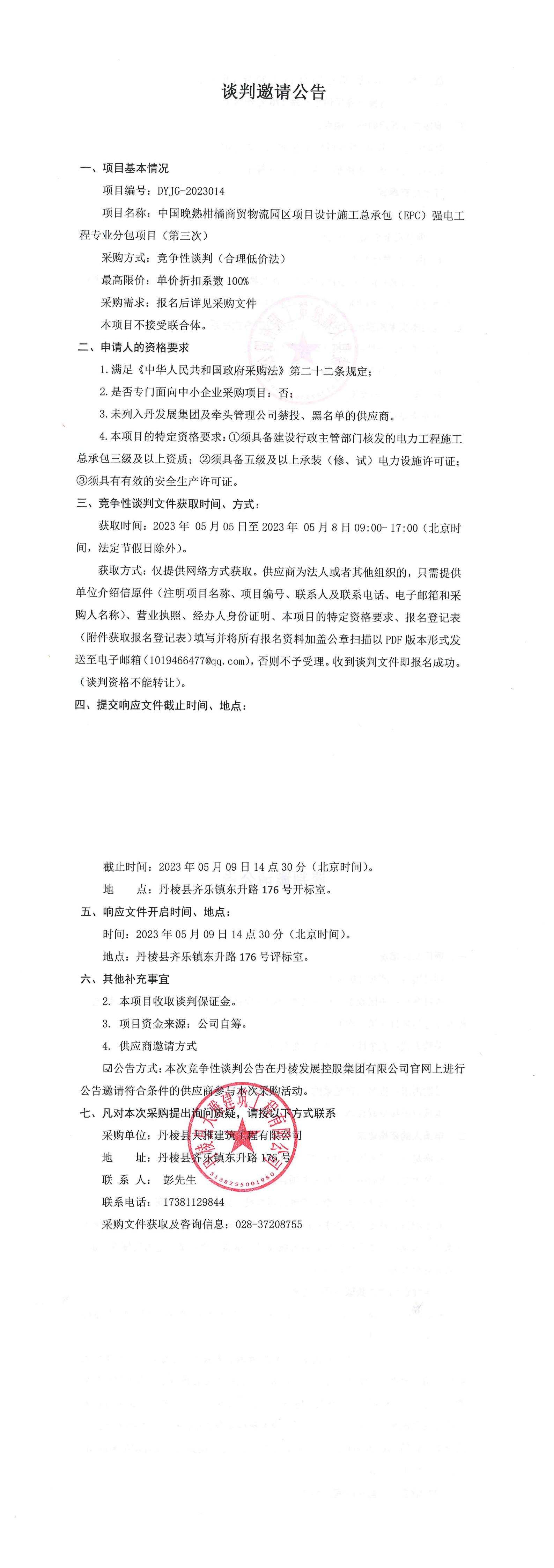 中國晚熟柑橘商貿(mào)物流園區(qū)項目設計施工總承包(EPC)強電工程專業(yè)分包項目(第三次)談判邀請公告