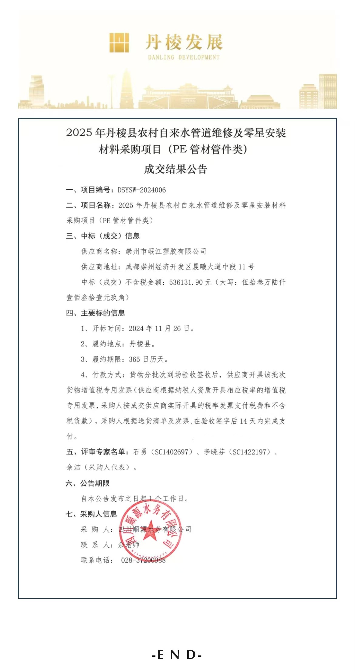 2025年丹棱縣農(nóng)村自來水管道維修及零星安裝材料采購項目(PE管材管件類)成交結(jié)果公告