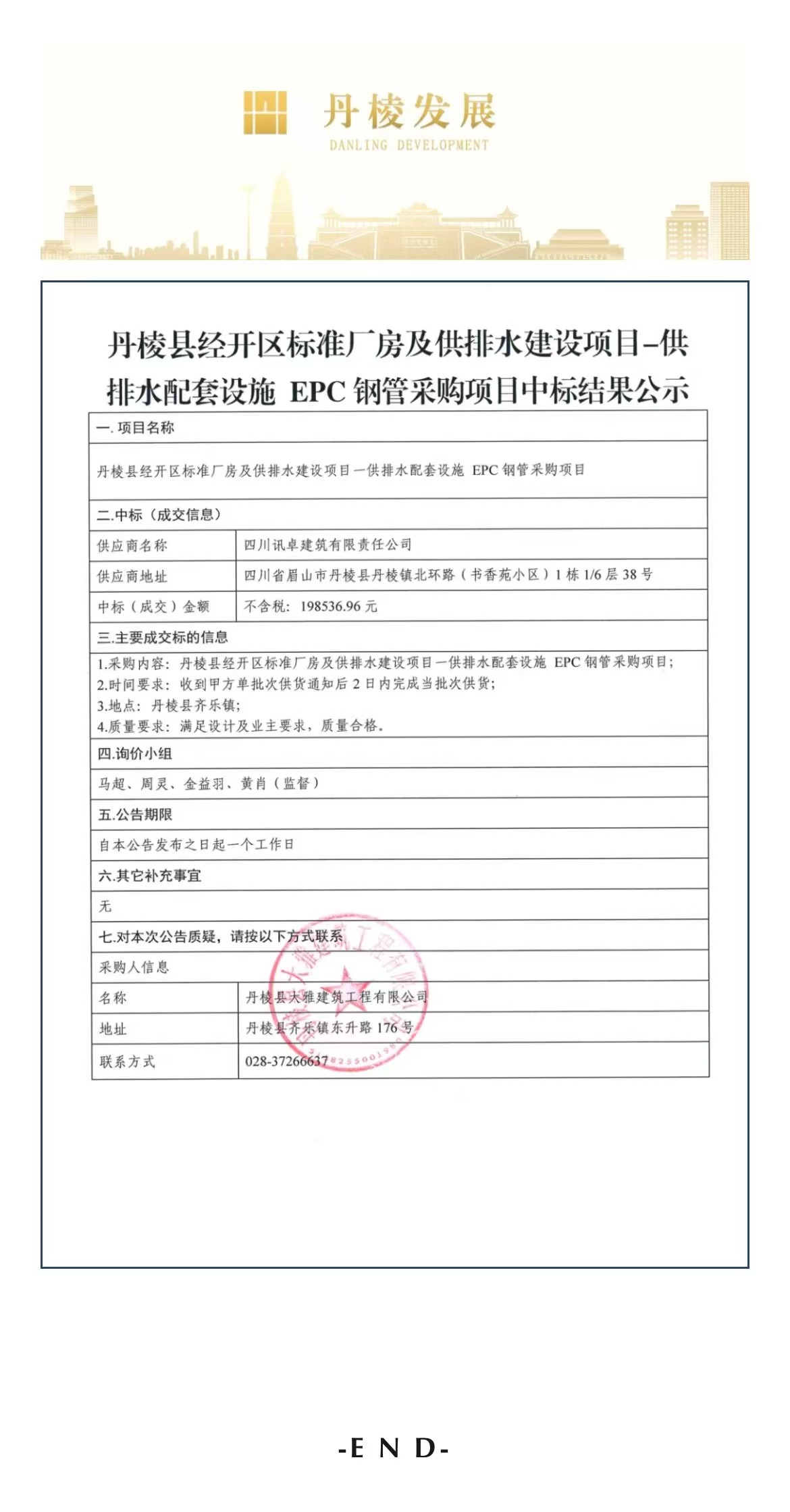 丹棱縣經(jīng)開區(qū)標準廠房及供排水建設(shè)項目——供排水配套設(shè)施EPC鋼管采購項目中標結(jié)果公示