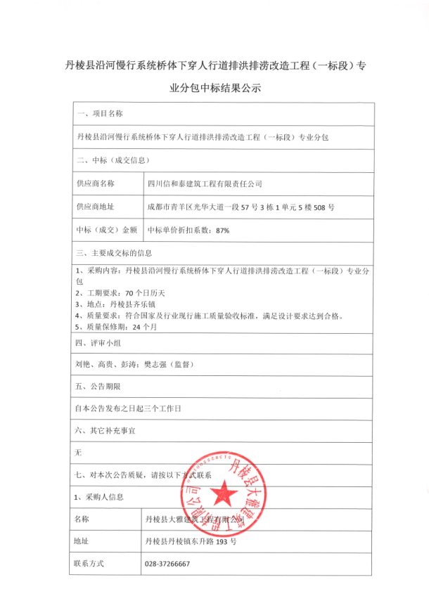 【大雅建筑公司】丹棱縣沿河慢行系統(tǒng)橋體下穿人行道排洪排澇改造工程(一標(biāo)段)專業(yè)分包中標(biāo)結(jié)果公示