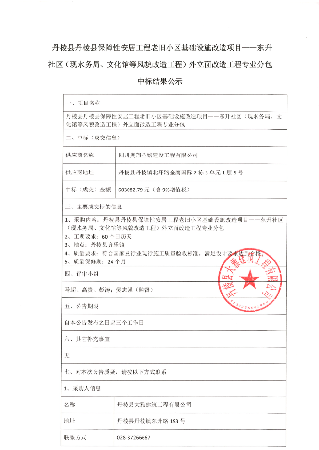 【大雅建筑公司】丹棱縣保障性安居工程老舊小區(qū)基礎(chǔ)設(shè)施改造項目--東升社區(qū)(現(xiàn)水務(wù)局、文化館等風(fēng)貌改造工程)外立面改造工程專業(yè)分包中標結(jié)果公示