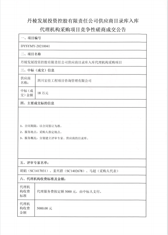 【丹發(fā)展公司】丹棱發(fā)展投資控股有限責任公司供應商目錄庫入庫代理機構采購項目競爭性磋商成交公告