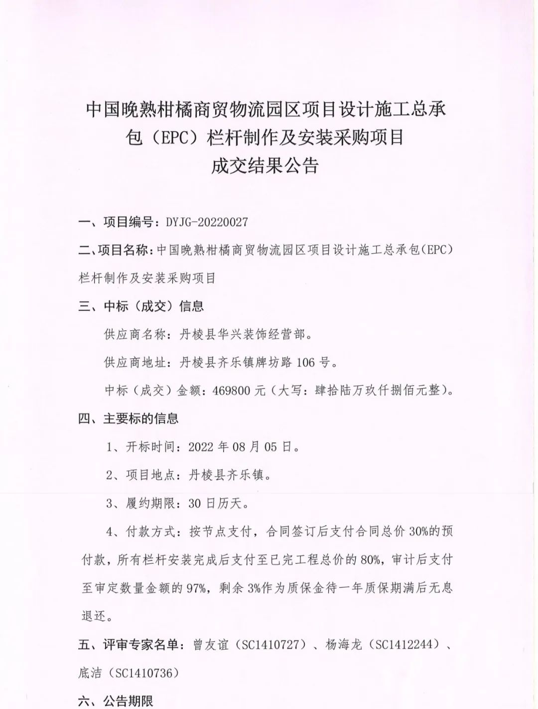 中國晚熟柑橘商貿(mào)物流園區(qū)項目設計施工總承包(EPC)欄桿制作及安裝采購項目成交結果公告