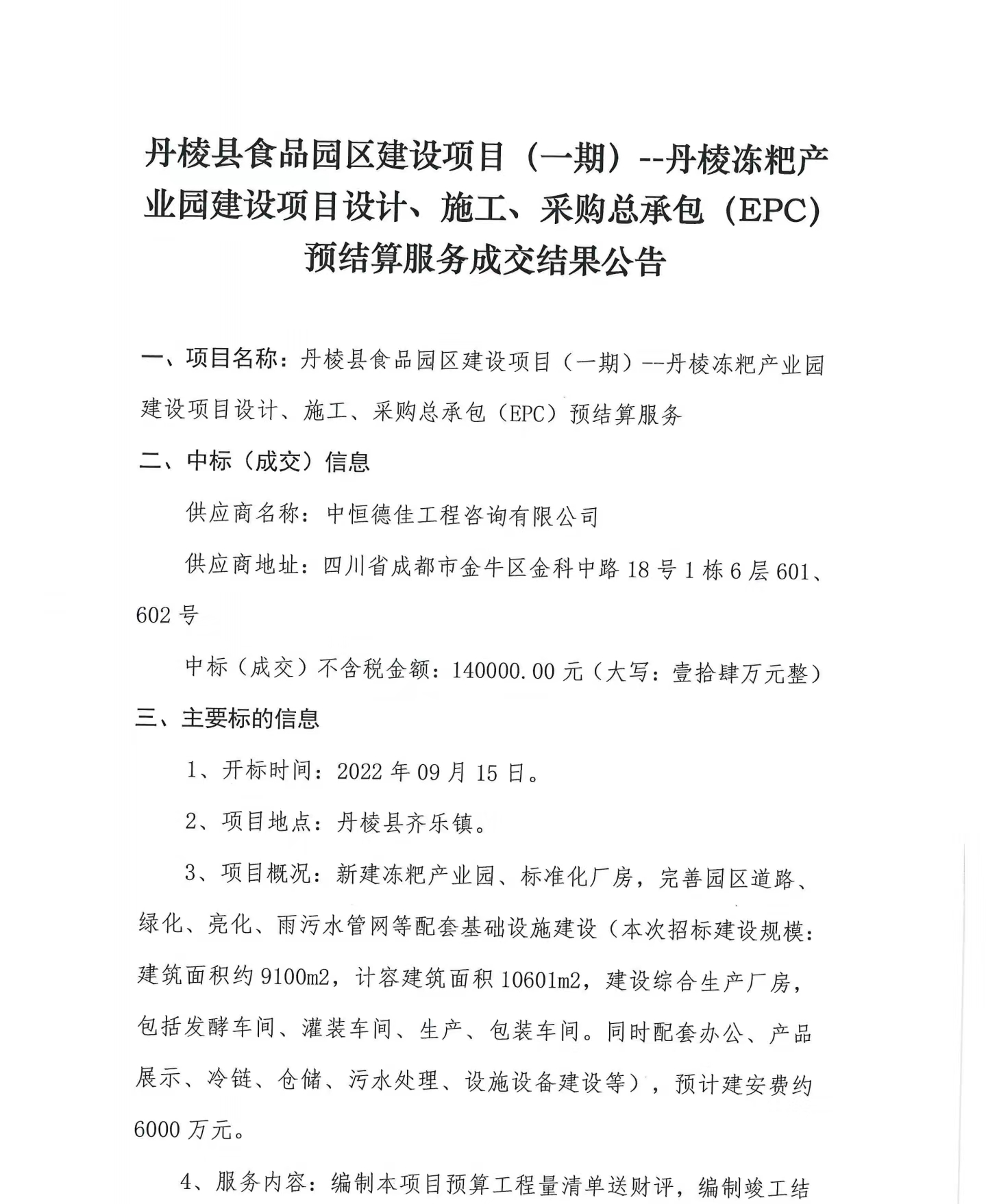 丹棱縣食品園區(qū)建設(shè)項(xiàng)目(一期)--丹棱凍粑產(chǎn)業(yè)園建設(shè)項(xiàng)目設(shè)計(jì)、施工、采購(gòu)總承包(EPC)預(yù)結(jié)算服務(wù)成交結(jié)果公告