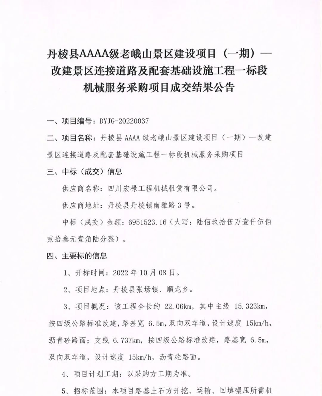 丹棱縣AAAA級老峨山景區(qū)建設項目(一期)--改建景區(qū)連接道路及配套基礎設施工程一標段機械服務采購項目成交結果公告