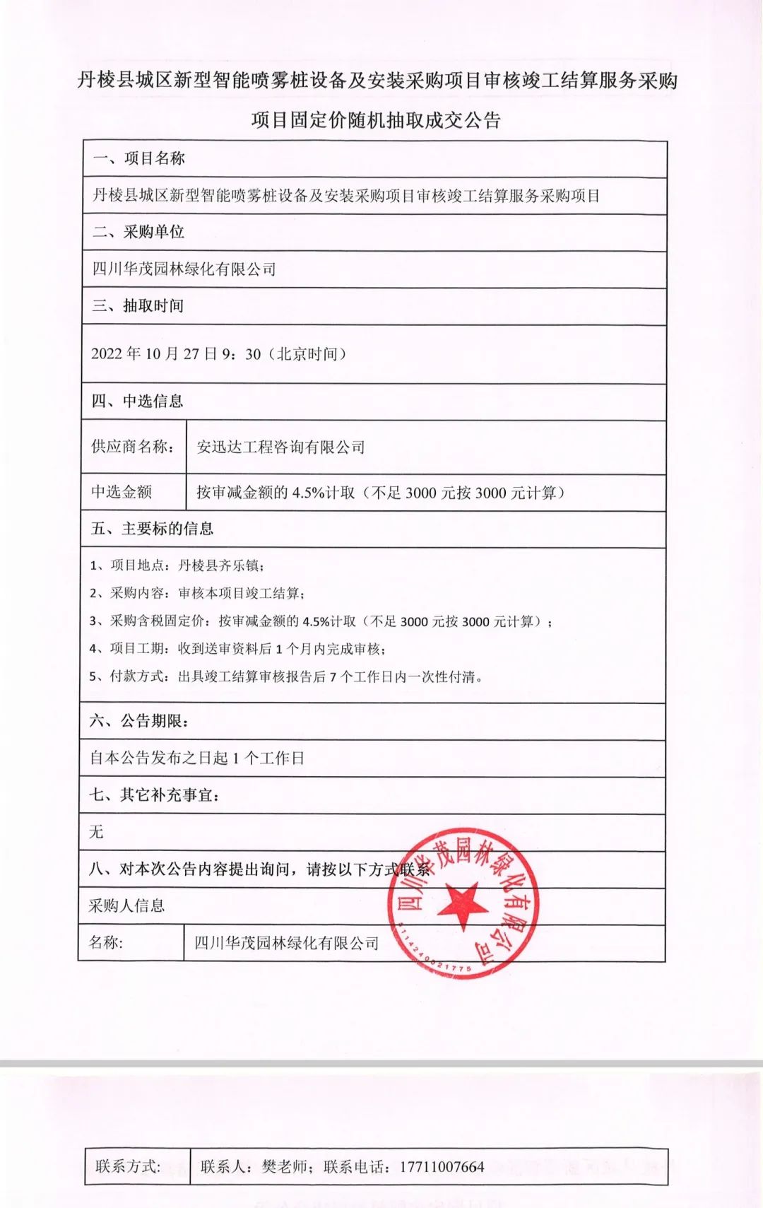 丹棱縣城區(qū)新型智能噴霧樁設(shè)備及安裝采購項目審核竣工結(jié)算服務采購項目固定價隨機抽取成交公告