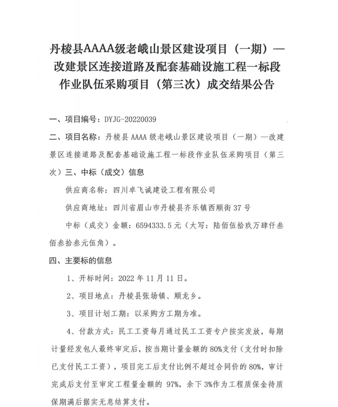 丹棱縣AAAA級老峨山景區(qū)建設(shè)項(xiàng)目 (一期)-改建景區(qū)連接道路及配套基礎(chǔ)設(shè)施工程一標(biāo)段作業(yè)隊(duì)伍采購項(xiàng)目 (第三次) 成交結(jié)果公告