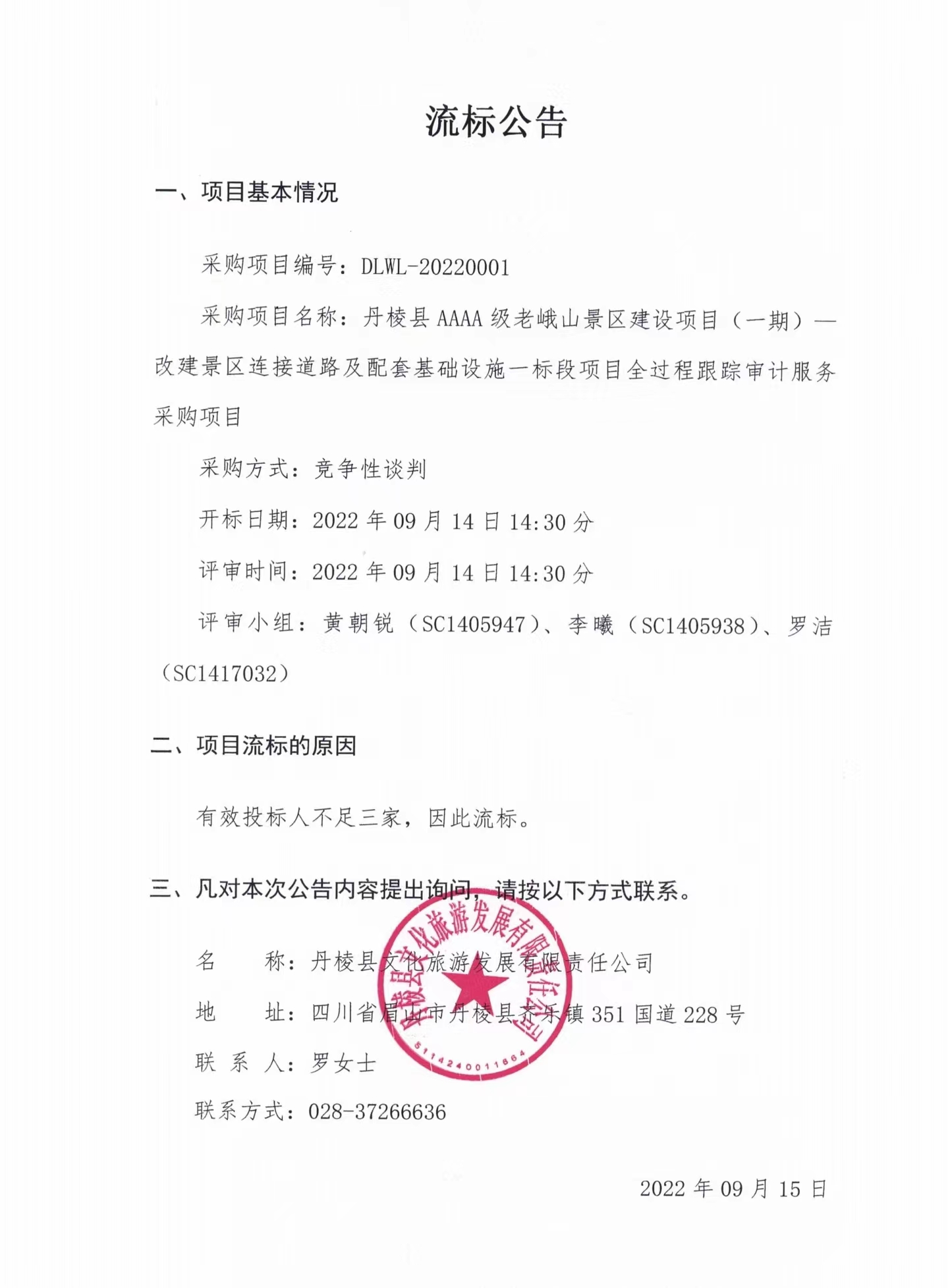 丹棱縣AAAA級(jí)老峨山景區(qū)建設(shè)項(xiàng)目(一期)--改建景區(qū)連接道路及配套基礎(chǔ)設(shè)施一標(biāo)段項(xiàng)目全過(guò)程跟蹤審計(jì)服務(wù)采購(gòu)項(xiàng)目流標(biāo)公告