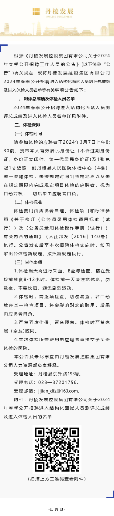 丹棱發(fā)展控股集團(tuán)有限公司關(guān)于2024年春季公開招聘進(jìn)入結(jié)構(gòu)化面試人員測(cè)評(píng)總成績(jī)及進(jìn)入體檢人員的公告
