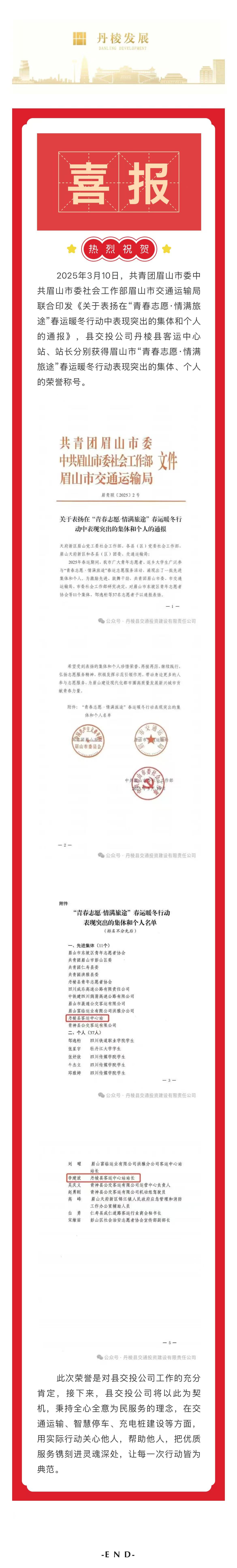 【縣交投公司】喜報(bào)!丹棱縣客運(yùn)中心站、站長(zhǎng)分別獲得眉山市“青春志愿·情滿(mǎn)旅途”春運(yùn)暖冬行動(dòng)表現(xiàn)突出的集體、個(gè)人榮譽(yù)稱(chēng)號(hào)