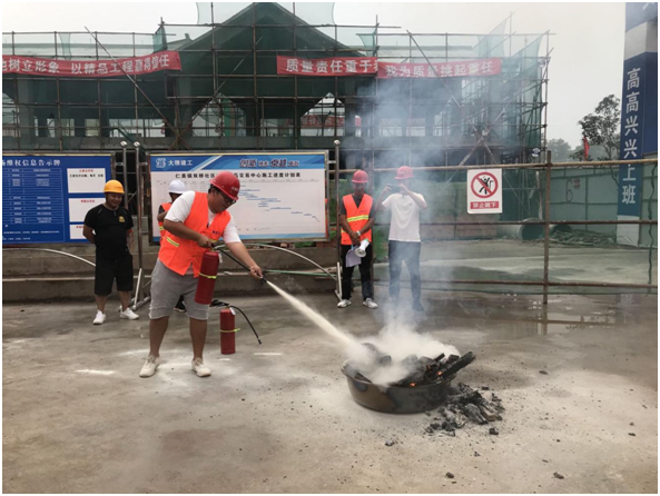 演練模擬施工現(xiàn)場材料堆場模板燃燒引起火災,項目現(xiàn)場人員發(fā)現(xiàn)火情,立即向項目管理人員報告,管理人員立即啟動《施工生產(chǎn)現(xiàn)場火災事故應急救援預案》。不到2分鐘,疏散引導組將火災現(xiàn)場被困人員全部安全有序疏散到了安全地帶,同時,保衛(wèi)警戒組做好巡邏檢查工作,禁止無關(guān)人員進入危險區(qū)域,消防滅火組及時進場切斷火災現(xiàn)場的電源,迅速利用干粉滅火器進行滅火。整個演練過程,組織得力,秩序井然。